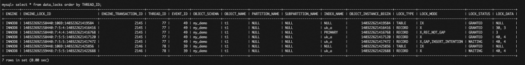 为了搞清楚这个问题,笔者关闭 MySQL 上的死锁检查逻辑(innodb_deadlock_detect设置为 OFF),然后再次尝试了上述的操作。结果发现,session 2 和 session 3 确实卡住了,结果前面提到的 performance_schema 下的 data_locks 表进行查看: