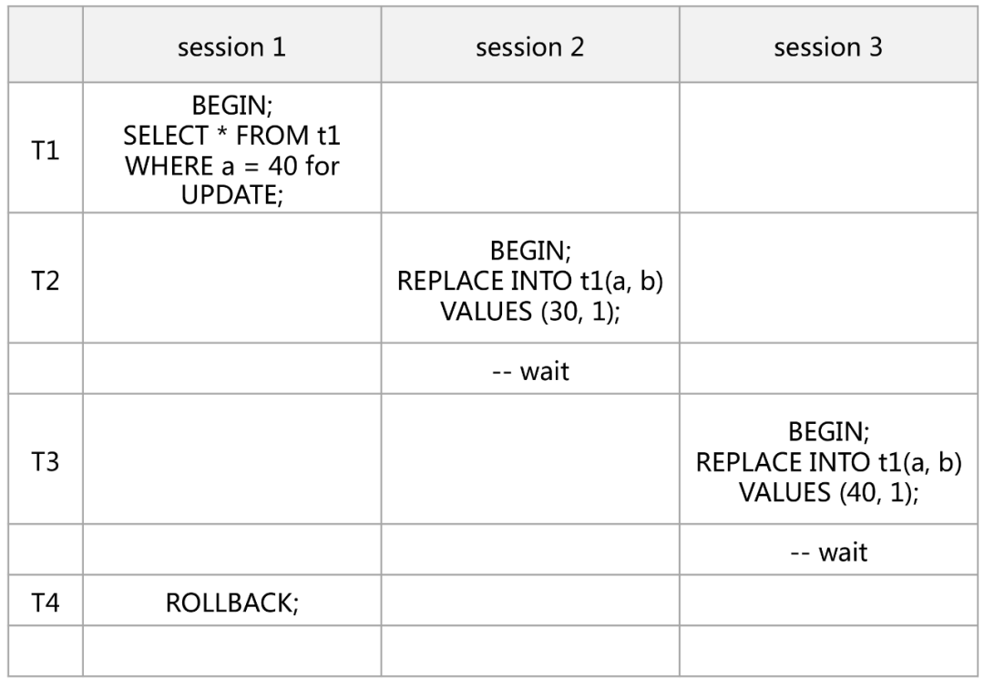 DROP TABLE IF EXISTS `t1`;CREATE TABLE `t1` (`id` int NOT NULL AUTO_INCREMENT,`a` int DEFAULT NULL,`b` int DEFAULT NULL,PRIMARY KEY (`id`),UNIQUE KEY `uk_a` (`a`)) ENGINE=InnoDB;INSERT INTO t1 values (1, 10, 0);INSERT INTO t1 values (2, 20, 0);INSERT INTO t1 values (3, 30, 0);INSERT INTO t1 values (4, 40, 0);INSERT INTO t1 values (5, 50, 0);