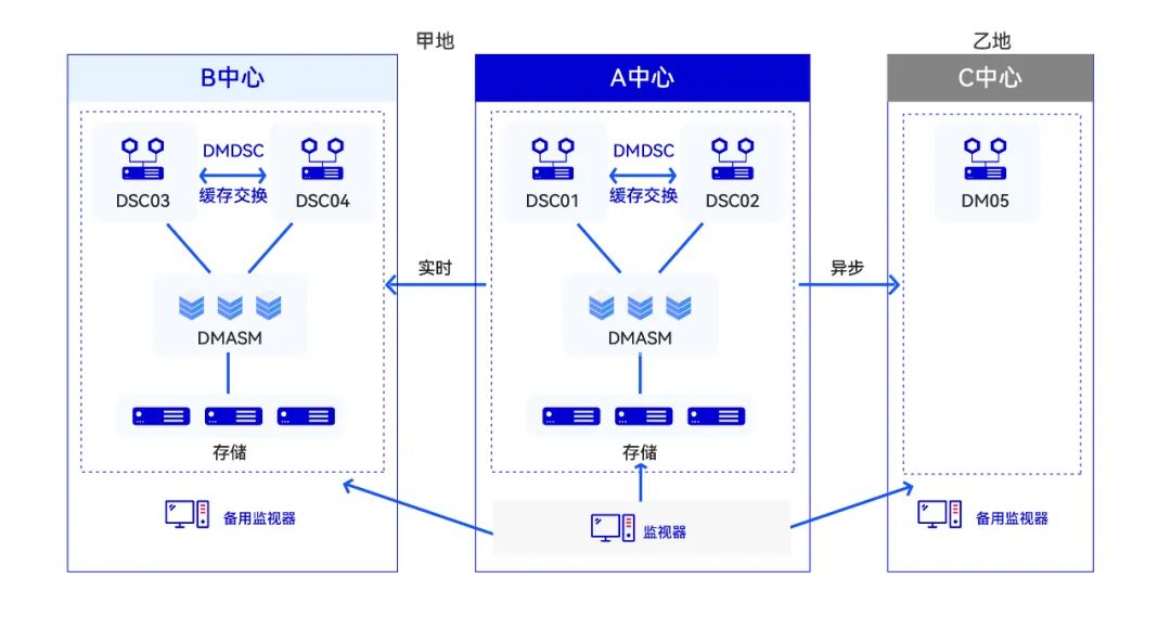 如图,拟在甲乙两地构建三中心的数据容灾系统,其中,A 中心作为主业务中心,部署两节点的达梦数据共享集群DMDSC,以承担日常业务运行,并具备单节点故障自动切换的能力,确保业务的连续性。