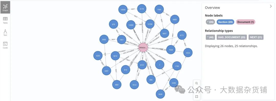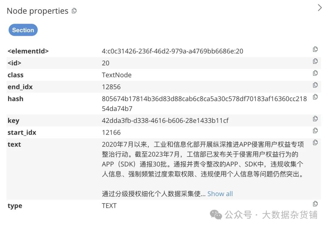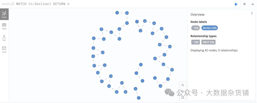 在文本框中输入MATCH (n:Section) RETURN n并运行它,我们将看到文档的一系列部分。通过点击并展开一个Section节点,我们可以看到它所连接的Chunk节点。