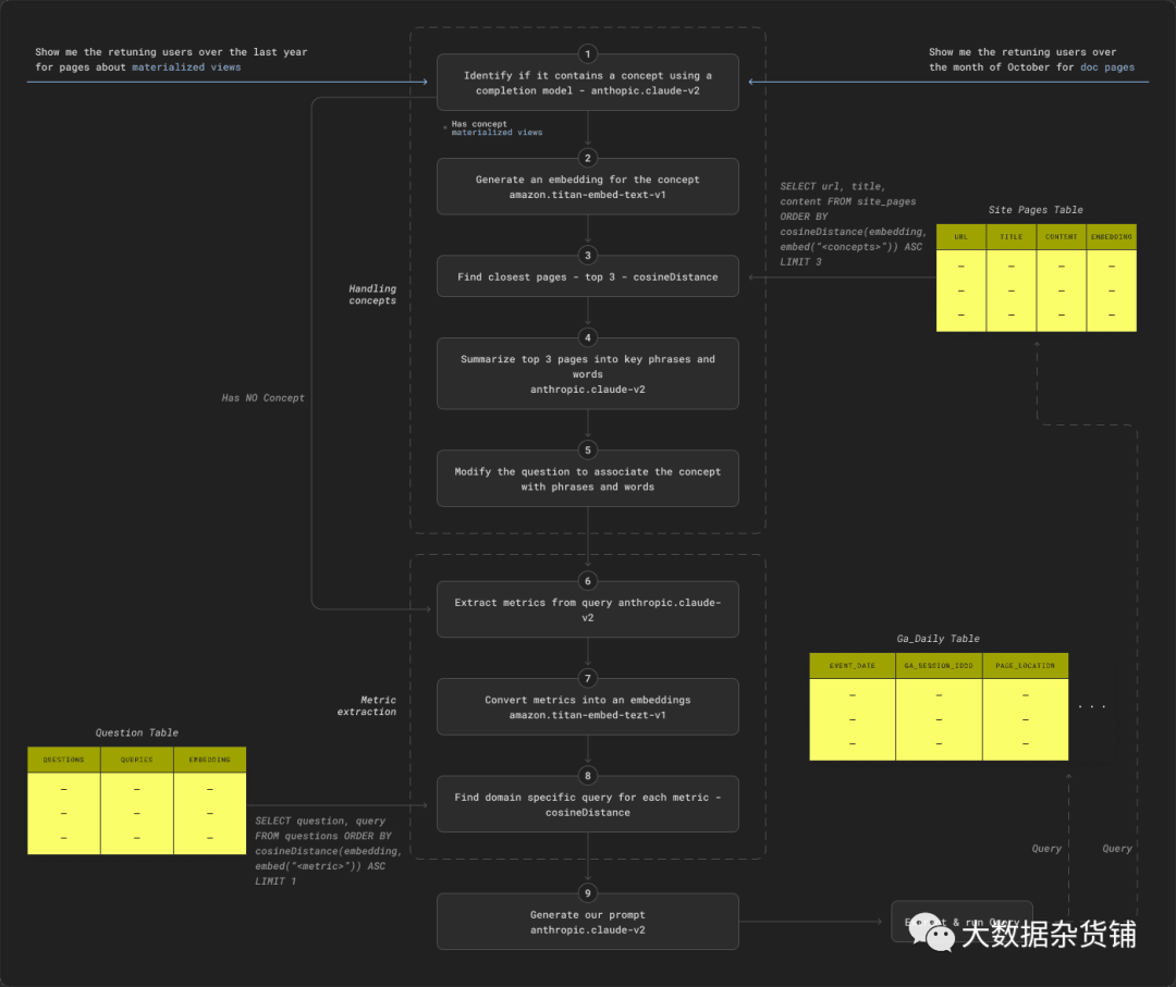 正如我们将在下面发现的,对于我们的用例,RAG 也是相关的,因为我们不仅需要提供表Schema,还需要提供可能的示例查询来解决问题,例如如何识别返回用户或 LLM 应如何处理不太结构化的问题例如“有关物化视图的帖子”。