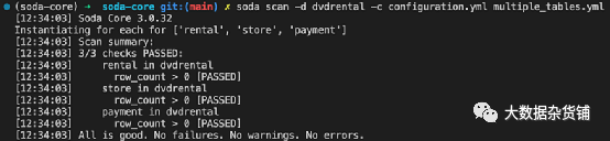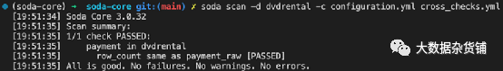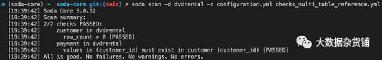 下面的代码将通过应用相关的 configuration.yml 和 checks.yml 文件来运行 DVD Rental 数据源的扫描。一开始,我将把 checks.yml 文件保留为空以查看输出。