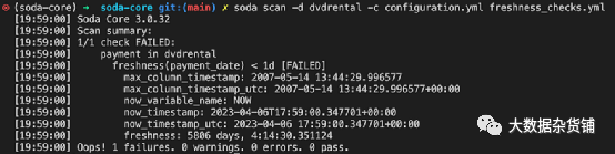 Soda Python 库支持编程检查,我们不需要一直使用 CLI。下面我创建了一个 Python 脚本来读取配置并检查文件并执行它们。为了得到错误,我将使用 freshness.yml 文件。