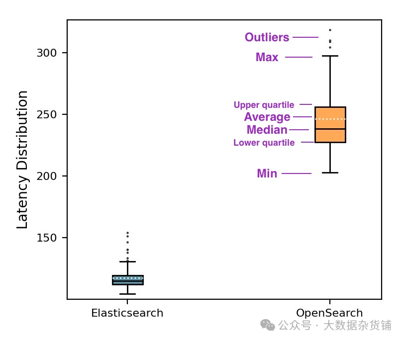 使用 t-test 检验对性能比较结果(重点关注请求的 p90(第 90 个百分位数))进行交叉验证,以确保两种解决方案之间的延迟测量存在统计差异。针对每种查询类型计算相对变化(以百分比表示)。我们还使用箱线图显示 100% 请求的延迟分布,箱线图显示最小值、最大值、中值、平均值和异常值。实际的方框显示了下四分位数和上四分位数,其中分别有 25% 和 75% 的观测值落在其中。通过这种方式,我们可以了解这些值的实际分布情况。
