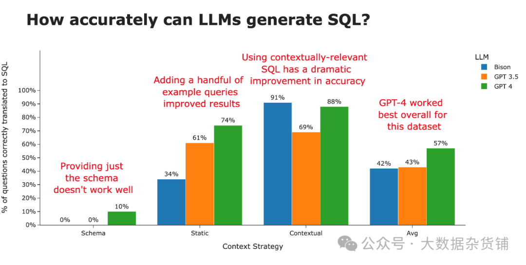 大语言模型本身仍然存在一些有趣的趋势。虽然 Bison 在模式和静态上下文策略中都处于堆的底部,但它通过完整的上下文策略迅速上升到顶部。对三种策略进行平均后, GPT 4 荣获 SQL 生成最佳 LLM 桂冠 。