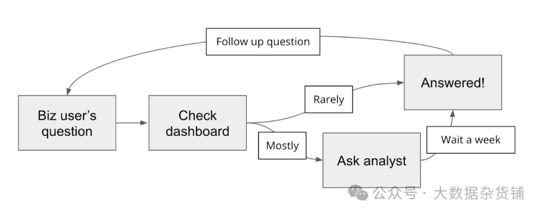 那么组织内部到底发生了什么? 产品经理、销售经理和高管等业务用户的数据问题将为业务决策和战略提供信息。他们会首先检查仪表板,但大多数问题都是临时和具体的,并且无法获得答案,因此他们会询问数据分析师或工程师 - 无论谁拥有上述技能的组合。这些人很忙,需要一段时间才能处理请求,一旦得到答复,业务用户就会提出后续问题。
