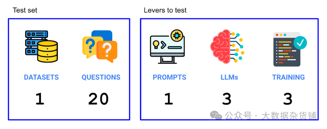 现在我们已经设置了实验,我们需要弄清楚哪些杠杆会影响准确性,以及我们的测试集是什么。我们尝试了两种杠杆(大语言模型和使用的训练数据),并运行了构成我们测试集的 20 个问题。因此,我们在此实验中总共运行了 3 个大语言模型 x 3 个情境策略 x 20 个问题 = 180 次单独试验。