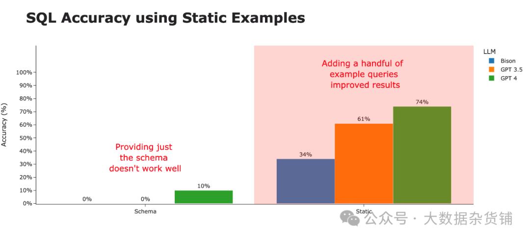 通过向 LLM 提供这些 SQL 查询的最相关示例,我们可以极大地提高能力较差的 LLM 的性能。在这里,我们为大语言模型提供了 10 个与该问题最相关的 SQL 查询示例(来自存储的 30 个示例列表),准确率直线上升。