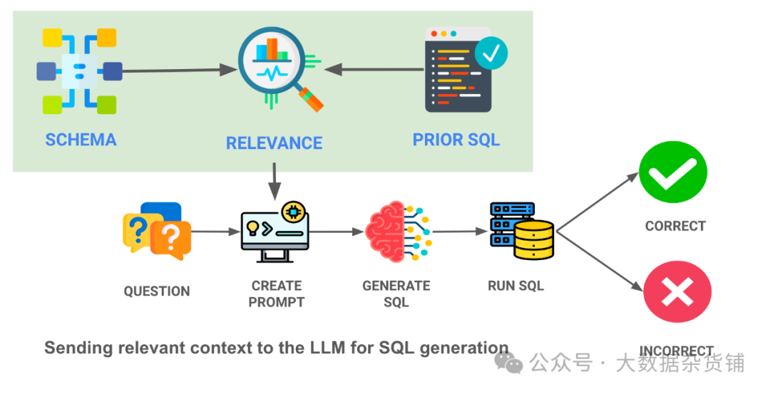 3.上下文相关的示例 。最后,我们将最相关的上下文(SQL / DDL / 文档)放入上下文窗口中,通过基于嵌入的向量搜索找到它。