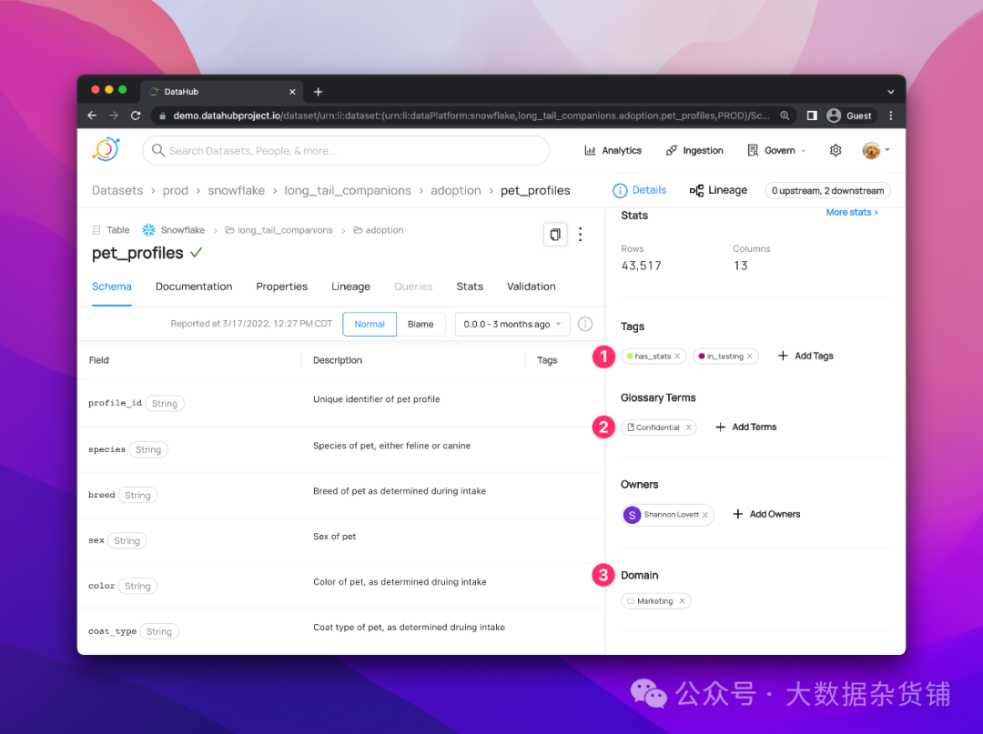 ·同步:将DataHub 中所做的更改同步到第 3 方系统。例如,将DataHub中添加的Tag反映到Snowflake中。