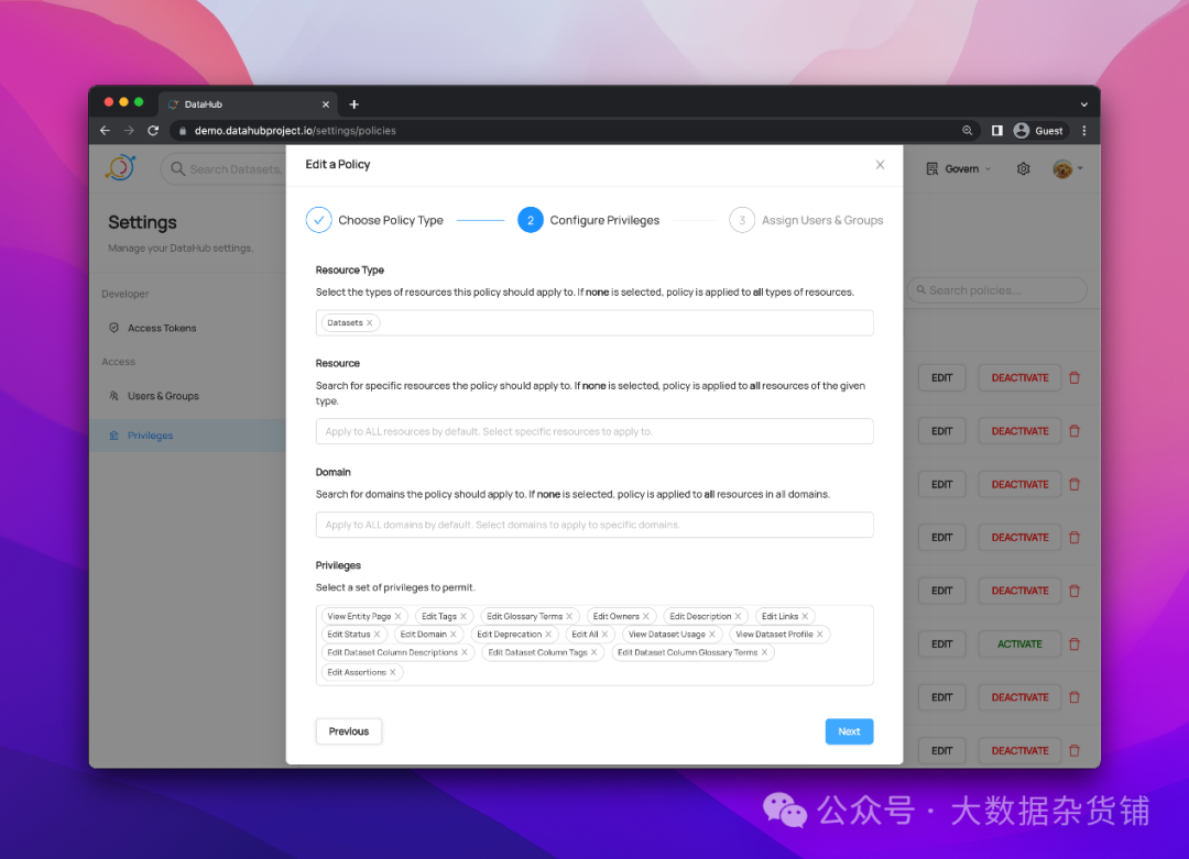 ·策略类型- 平台(顶级 DataHub 平台权限,即管理用户、组和策略)或元数据(操作所有权、标签、文档等的能力)