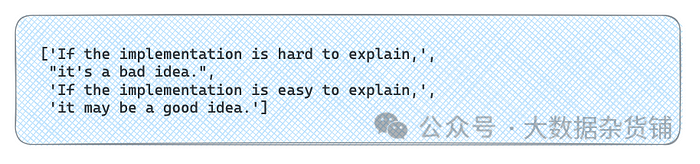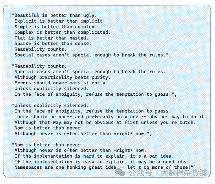 text_splitter = RecursiveCharacterTextSplitter(chunk_size = 300 ,chunk_overlap = 100 ,length_function = len ,is_separator_regex = False ,)text_splitter.split_text(zen)