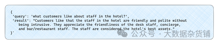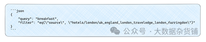 结果,我们从模型中得到的初始问题分为两部分:语义一 ( breakfast) 和元数据过滤器 ( source = hotels/london/uk_england_london_travelodge_london_farringdon)