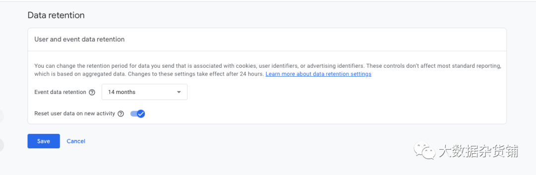 数据保留。默认情况下,GA4 会将数据保留两个月。这可以增加到 14 个月,更长的期限可到 360 个月(同样,每年 150,000 美元)。虽然我们目前没有多年的数据,但我们希望能够使用 2 个月以上的数据点来识别随时间变化的Schema,例如季节性趋势。