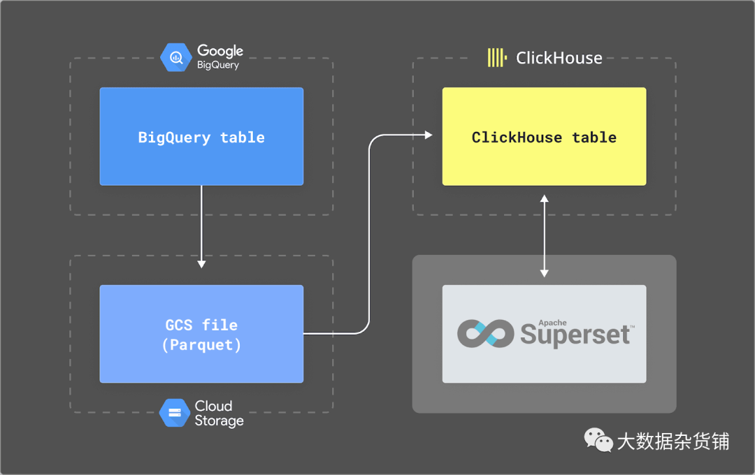 成本和性能。我们希望通过实时仪表板定期运行查询,尤其是访问实时数据。虽然 BigQuery 非常适合对复杂查询进行临时分析,但它会对扫描的数据收费,从而导致成本难以预测。相反,ClickHouse Cloud 通过小型集群以固定成本提供这些查询(例如每月 < 200 美元的开发层服务)。此外,BigQuery 通常会产生最小的查询延迟。我们知道 ClickHouse 将提供毫秒级响应时间,并且更适合平面Schema(只有两个表)和聚合密集型查询。有关 BigQuery 和 ClickHouse 之间差异的更多详细信息,请参阅此处。