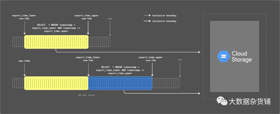 可以更定期地从日内表中导出实时数据。目前,我们每小时安排一次导出。我们每小时导出最后 60 分钟的数据。不过,我们偏移了此窗口,以允许事件可能出现延迟并出现在 BigQuery 中。虽然通常不会超过 4 分钟,但为了安全起见,我们使用 15 分钟。因此,每次运行导出时,我们都会导出从now-75mins