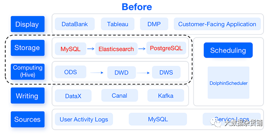 数据服务公司如何构建数据仓库?我曾担任一家平台的实时计算工程师,该平台旨在允许用户搜索公司的业务数据、财务和法律详细信息。已采集300多个维度、3亿+实体信息。我和我的同事的职责是确保这些数据的实时更新,以便我们能够为我们的注册用户提供最新的信息。这就是我们数据仓库面向客户的功能。除此之外,它还需要支持我们内部营销和运营团队的临时查询和用户细分,这是随着我们业务的增长而出现的新需求。我们的旧数据仓库由当时最流行的组件组成,包括 Apache Hive、MySQL、Elasticsearch 和 PostgreSQL。它们支持我们数据仓库的数据计算和数据存储层:- 数据存储:MySQL 为 DataBank、Tableau 和我们面向客户的应用程序提供数据。Elasticsearch 和 PostgreSQL 为我们的 DMP 用户细分系统服务:前者存储用户分析数据,后者存储用户组数据包。