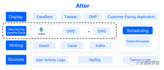 可以想象,长而复杂的数据管道维护成本高,并且不利于开发效率。此外,它们无法进行即席查询。因此,作为数据仓库的升级,我们用 Apache Doris(一个基于 MPP 的开源分析数据库)替换了大部分组件。