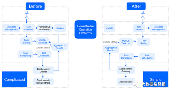 之前:基于元数据创建用户分段任务后,相关用户ID 会写入 PostgreSQL 配置文件列表和 MySQL 任务列表中。同时,Elasticsearch 会根据任务条件执行查询;结果产生后,会更新任务列表中的状态,并将用户组位图包写入PostgreSQL。( PostgreSQL 插件可以计算位图的交集、并集、差集。)然后 PostgreSQL 会为下游操作平台提供用户组数据包。Elasticsearch 和 PostgreSQL 中的表不可重用,使得该架构成本效益低下。另外,在执行新类型的查询之前,我们必须预先定义用户标签。这减慢了事情的进展。之后:用户ID 只会写入 MySQL 任务列表。对于首次分段,Apache Doris 将根据任务条件执行即席查询。在后续的分段任务中,Apache