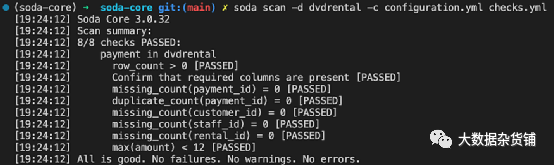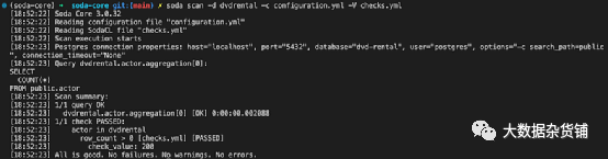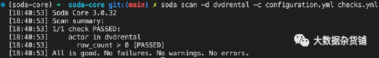 下面的代码将通过应用相关的 configuration.yml 和 checks.yml 文件来运行 DVD Rental 数据源的扫描。一开始,我将把 checks.yml 文件保留为空以查看输出。