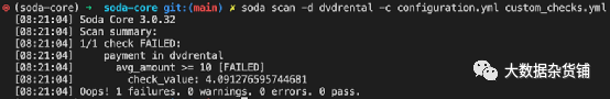 如上所示,我们的检查已成功通过。但是Soda如何转换用SodaCL编写的check语句呢?如果我们想查看 Soda 生成的 SQL 查询,我们需要在扫描中添加“-V”参数。