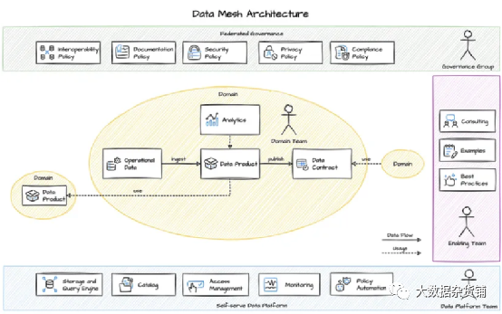 域。域是一个独立的业务单元,拥有并管理自己的数据。每个域都有明确的业务目的,并负责定义数据建模、实体、模式和策略来管理数据。这一概念不同于为营销或销售等不同团队设计的数据仓库架构中的数据集市。在数据网格体系结构中,销售可以有多个领域,这取决于团队可能拥有的不同重点/领域。 数据产品。数据产品是域产生的最终结果,可供其他域或应用程序使用。每个数据产品都有明确的商业目的。一个域可以处理多个数据产品。并非所有数据资产都将被视为数据产品或应接受数据产品处理(尽管在完美的世界中是这样)。数据产品是在组织中发挥关键作用的数据资产。 数据基础设施。数据基础设施包括管理域内数据所需的工具和技术,类似于软件应用程序的容器化微服务。这包括数据存储、处理和分析工具。 数据治理。数据治理由每个域管理。这是指管理数据质量、隐私和安全的一套程序。 网格API。就像微服务通过HTTP REST API公开所有内容一样,数据网格域将通过定义良好的接口公开所有内容,其他域和数据产品可以使用该接口。