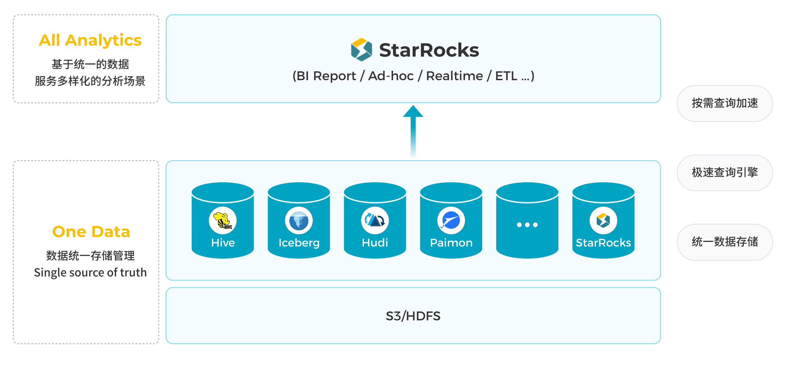 以开源产品 StarRocks 为例,StarRocks 采用了开放的 lakehouse 架构,所有数据统一录入到湖中,再按需供业务端进行数仓的应用建设,湖与仓充分融合并共享一份数据,彼此互联互通,同时,该架构能兼顾成本和性能,同时在资源扩展上也能达到弹性的效果。