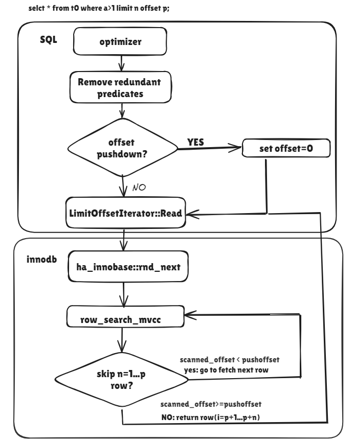 在SQL层的优化器阶段,判断是否满足Limit Offset下推的条件。如果满足,则设置offset的值为0,并通知InnoDB层需跳过的offset的值,即SQL层对InnoDB层返回的结果不再进行offset的过滤。