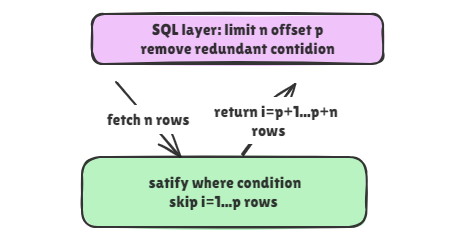 首先,通过启用OP,offset 范围内的行不会再传输到SQL层,从而节省了存储引擎和SQL层之间多次来回交互时间;其次,对于非覆盖索引扫描(non-covering index,即查询访问二级索引之后还必须访问表),直接跳过offset范围内的行,可以节省对这些行回表访问的开销。这种对offset 的提前处理的方式,可以节省数据处理时间,特别是当offset 非常大时。
