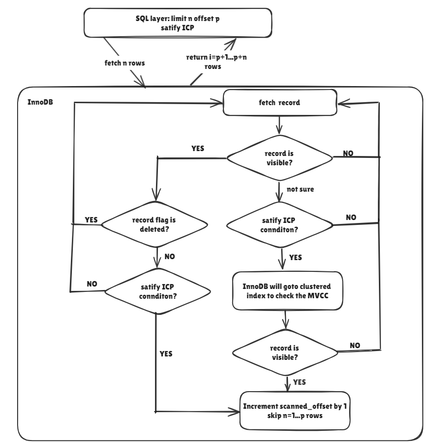 对于ICP生效的SQL语句,SQL层在判断满足OP的约束条件之后,会向InnoDB层获取n条记录,InnoDB层则会跳过满足ICP条件的p条记录,把满足ICP条件的n行记录返回给SQL层,如图3所示。