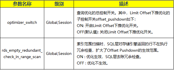 create table t1(a int, b int, INDEX(b));insert into t1 values(4,4),(5,5),(6,6);set rds_empty_redundant_check_in_range_scan = off;mysql> explain select a,b from t1 where b>2 limit 100 offset 1;+----+-------------+-------+------------+-------+---------------+------+---------+------+------+----------+----------------------------------------------+| id | select_type | table | partitions | type | possible_keys | key | key_len | ref | rows | filtered | Extra |+----+-------------+-------+------------+-------+---------------+------+---------+------+------+----------+----------------------------------------------+| 1 | SIMPLE | t1 | NULL | range | b | b | 5 | NULL | 3 | 100.00 | Using offset pushdown; Using index condition |+----+-------------+-------+------------+-------+---------------+------+---------+------+------+----------+----------------------------------------------+1 row in set, 1 warning (0.00 sec)