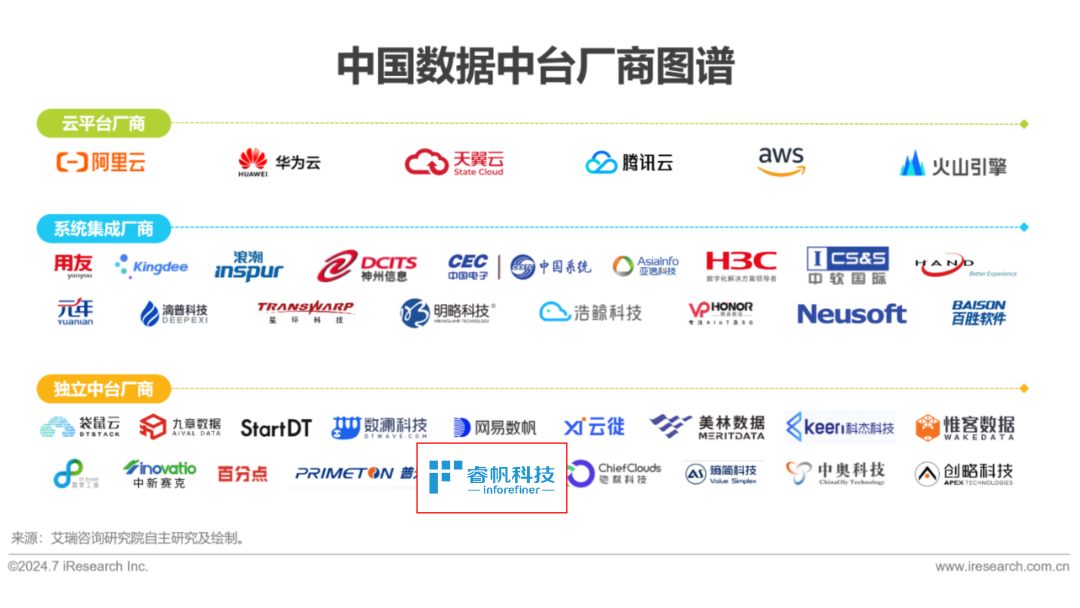 近日,艾瑞咨询发布了《2024年中国数据中台行业研究报告》,睿帆科技凭借在数据中台领域优秀的产品研发能力和丰富的成果案例积累,再次入选“独立数据中台”领域代表厂商,技术与市场能力获行业认可。