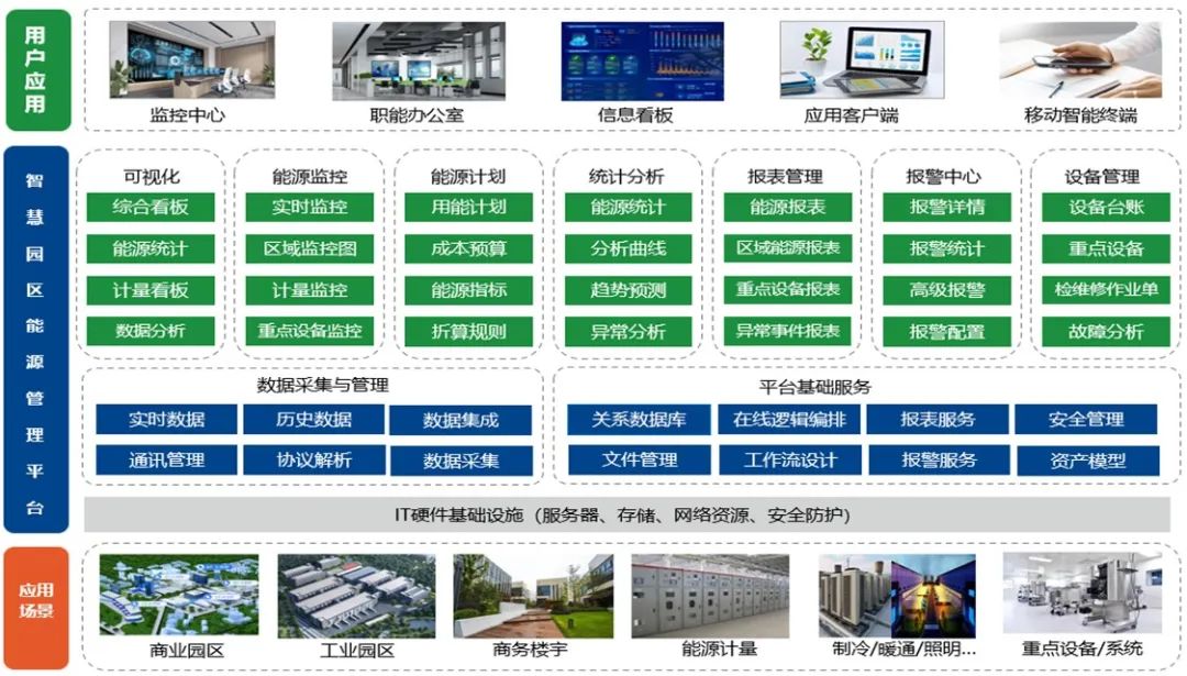 随着园区不断发展与升级,能源管理存在能耗监测不准确、数据分散、能效分析不足、各业务环节隔离等问题,急需建设新的能源管理平台,便于园区管理人员、物业运维人员及时了解园区能源使用情况,提升能效,保障能源供应,符合相关的能源监管规范等。