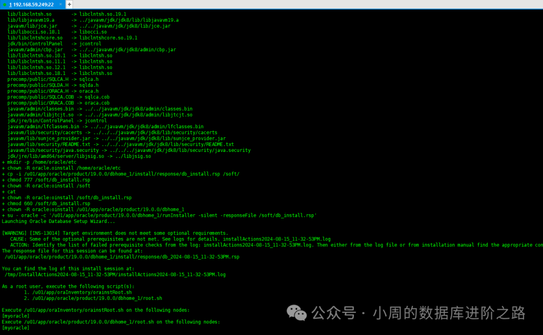 su - oracle -c "/u01/app/oracle/product/19.0.0/dbhome_1/runInstaller -silent -responseFile /soft/db_install.rsp"
