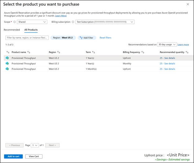 您可以在 Azure 门户1中购买 Azure OpenAI(国际版)PTU 预留实例,对包年预留提供两种付费模式供您选择:提前全部预付或按月支付费用2,两种付费模式的价格相同。购买 PTU 预留实例前您需要注意: