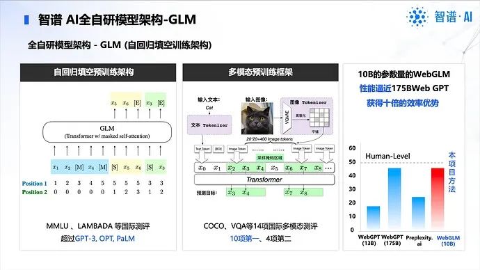 孙万礼老师介绍了 GLM 大模型,一个具有 10B 参数量、性能接近 175B GPT 的自回归填空训练架构,并在多项国际测评中超越 GPT-3 等模型。智谱 AI 建立了千亿级大模型技术体系,对标 OpenAI 产品线,提供多模态、语言和代码生成大模型,广泛应用于能源、医疗、金融等行业,推动产业化落地。
