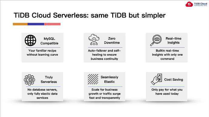 TiDB Cloud Serverless 提供了一个高度可扩展、完全托管的数据库服务,支持 OLTP 扩展性、ACID 事务、MySQL 兼容性,并具备高可用性与实时分析能力。它允许用户按需支付,实现成本节约,同时提供实时洞察和零停机时间的敏捷开发体验。TiDB Cloud Serverless 还集成了向量搜索功能,支持AI应用的数据库需求,预计将在 2024 年 10 月推出。