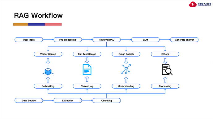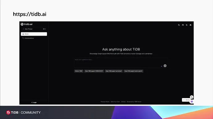 此外,还尝试了将 TiDB 作为向量存储,使它们能够响应超出 LLM 知识库范围的查询,以支持创建能够处理复杂查询的 AI 应用程序,即检索增强生成 (RAG) 应用程序,并通过知识图谱方法进一步增强这些应用的性能。