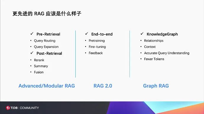 何傲老师在现场和大家一起探讨了使用 TiDB Vector 构建 RAG AI 应用的方法,指出了大型语言模型的局限性,并提出了 RAG 作为一种成本效益高、实现简单的解决方案。TiDB Serverless 结合向量搜索功能,支持标准 SQL、向量运算和多种度量指标,集成了 LangChain 等工具。然而,RAG 也存在问题,如工程化时的多个失败点。更先进的 RAG 应包括预检索、后检索处理、端到端训练和知识图谱集成,以提高准确性和效率。