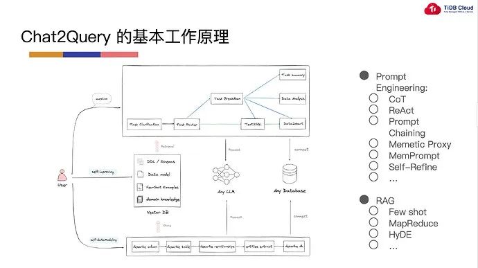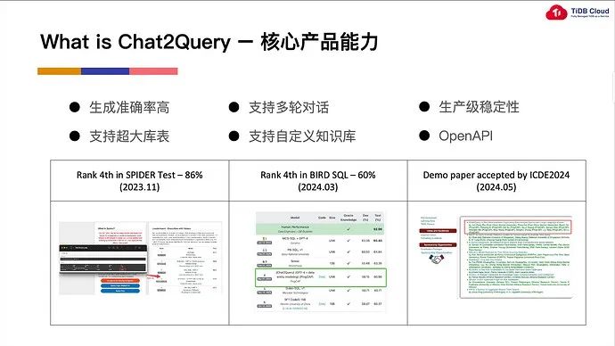 钮博彦老师介绍了 TiDB Cloud 的 Chat2Query 服务,一项基于 LLM 的 NL2SQL 应用,它在 SPIDER 测试和 BIRD SQL 中排名靠前,展示了其准确性和稳定性。Chat2Query 支持超大库表、多轮对话和自定义知识库,适用于 SQL Copilot 和数据探索等场景。用户可通过 OpenAPI 和 Demo App TiInsight 快速上手,享受这项增值服务带来的便利。