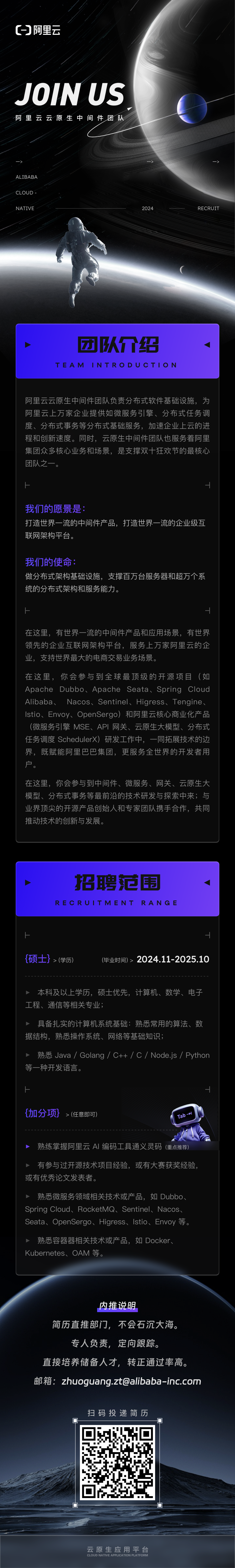 熟练掌握 AI 编码工具通义灵码优先。 有参与过开源技术项⽬经验,或有⼤赛获奖经验,或有优秀论⽂发表者。 熟悉微服务领域相关技术或产品,如 Dubbo、Spring Cloud、RocketMQ、Sentinel、Nacos、Seata、OpenSergo、Higress、Istio、Envoy 等。 熟悉容器器相关技术或产品,如 Docker、Kubernetes、OAM 等。