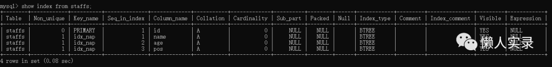 sql查询严格按照索引的顺序name,age,pos。该语句没有age,导致不会使用pos索引,只使用了name的索引,所以,type会是ref,ref是const。