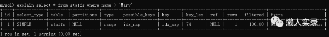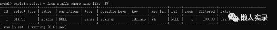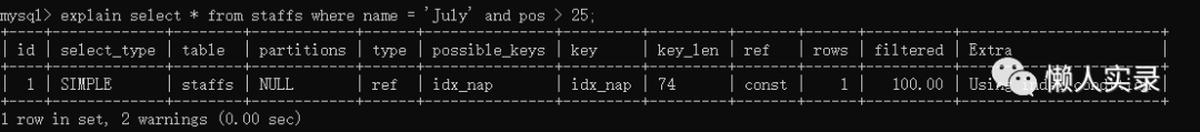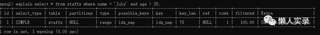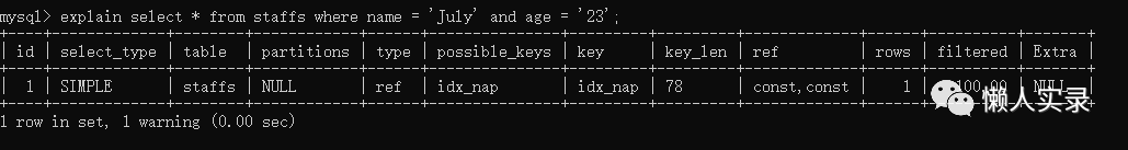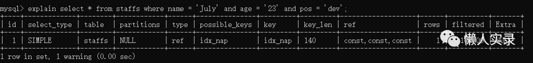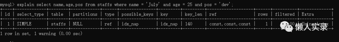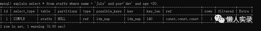 explain select name,age,pos from staffs where name = 'July' and age = 25 and pos = 'dev';