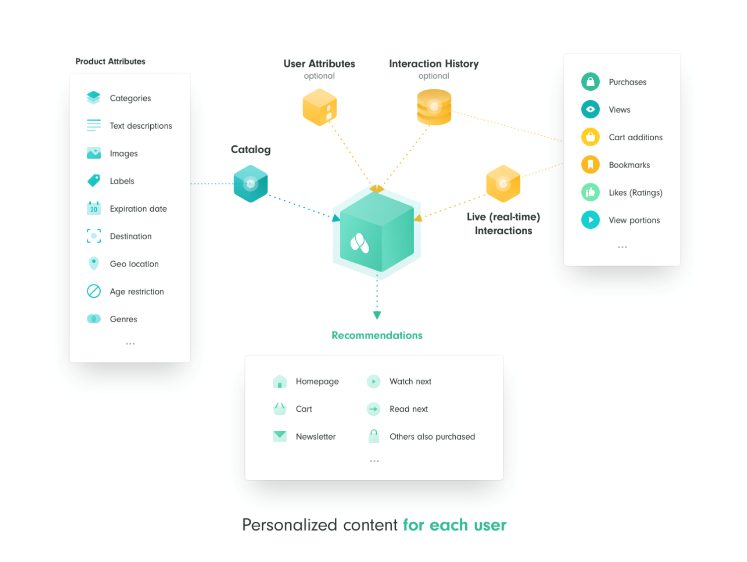 高级推荐引擎实时处理用户的现场行为以及给定的产品或内容特征。这意味着它们会立即对目录中的每次新点击或新更改做出反应。用户行为的示例包括点击、喜欢、购买或观看部分等互动,而分析的内容或产品属性包括类别、图像、价格或文本。