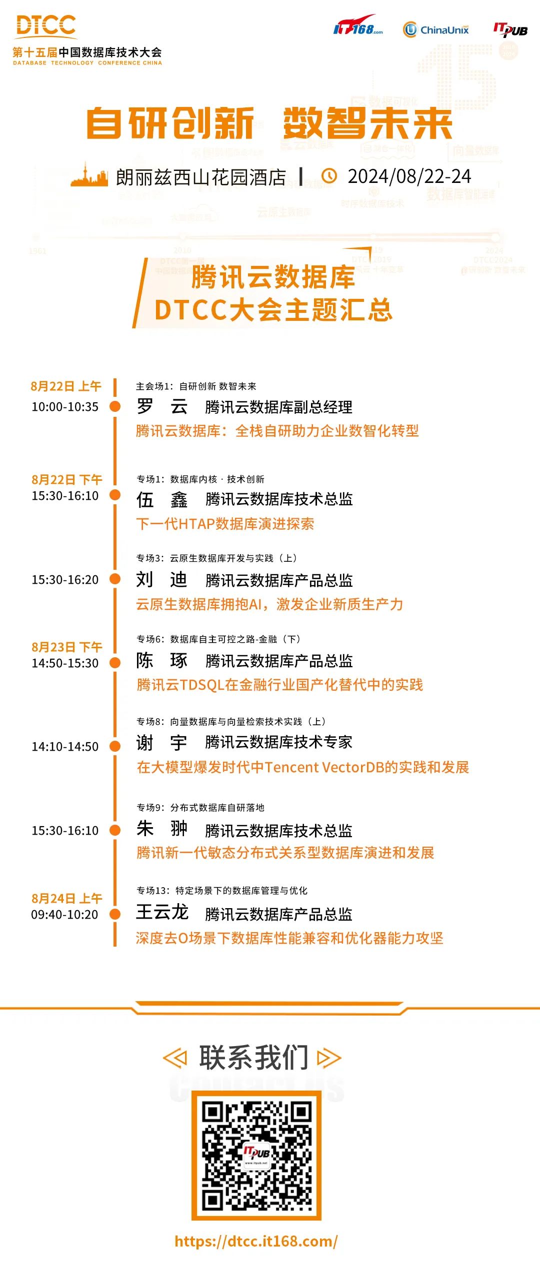 大会即将拉开帷幕,精彩内容不容错过。腾讯云数据库诚邀您一起参加DTCC大会,共同探索数据库技术的无限可能,携手拥抱数智化未来!这将是一个学习、交流和创新的重要平台,我们期待与您共同书写数据库技术的新篇章!