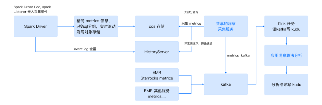 b. 备用方式:基于 HistoryServer 采集,这是一个降级采集数据的通道,仅作用于异常情况。DLC 原本就在每个地域部署了一个 HistoryServer,用于用户方便查看 Spark UI 分析任务,但由于 HistoryServer 回放大量任务的 eventLog 成本过高且不稳定,所以仅作为备用的降级方案。