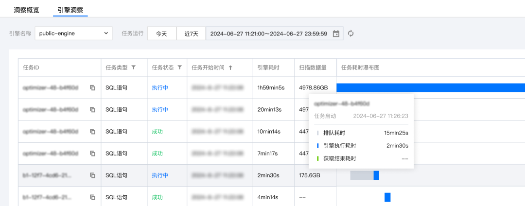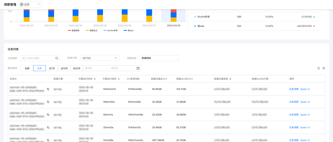 1. 运行状态洞察:对 Spark 引擎有整体运行状况洞察的诉求,如:各引擎下运行中的任务资源使用分布情况,任务运行 cpu 总耗时,任务引擎内排队时长和执行时长分析,数据扫描大小,数据 shuffle 大小等都有直观的展示与分析。
