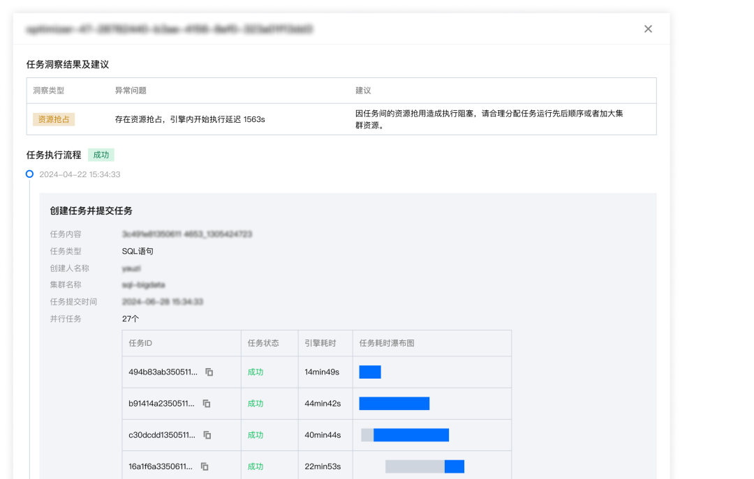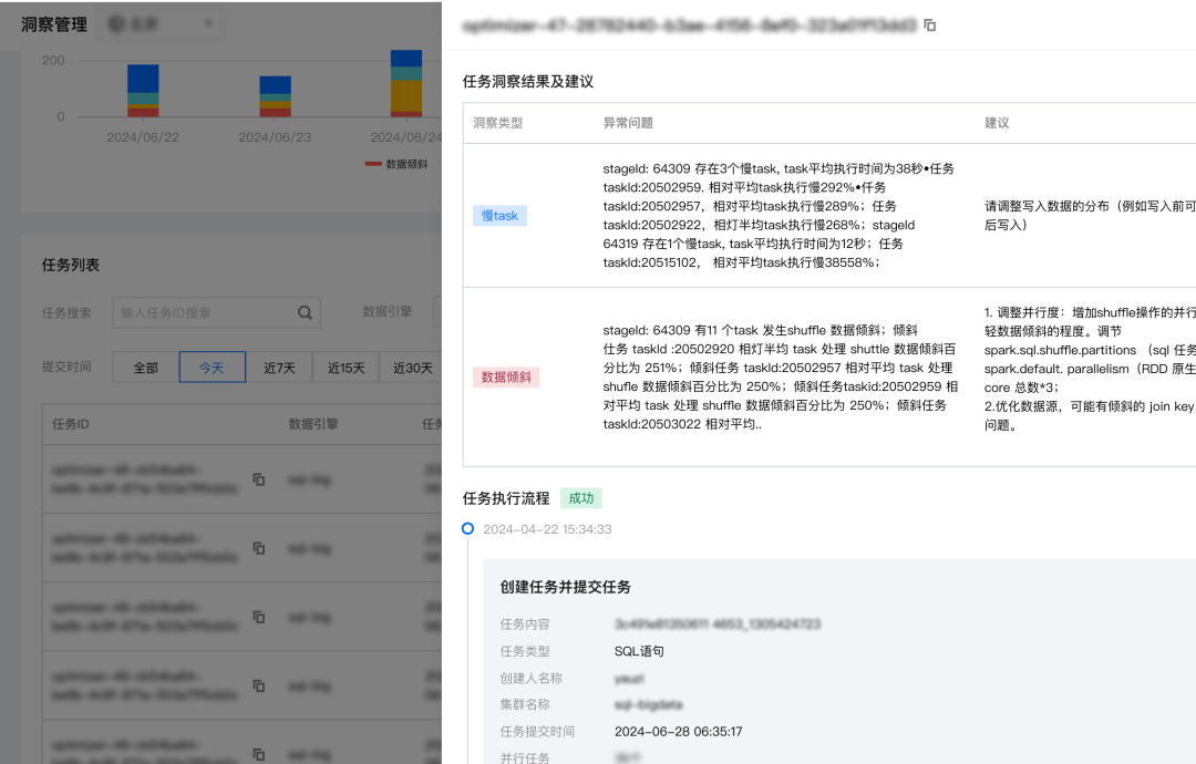2. 资源治理判断:快速定位有问题的大任务并提供针对性优化建议,帮助用户完成降本增效的诉求。