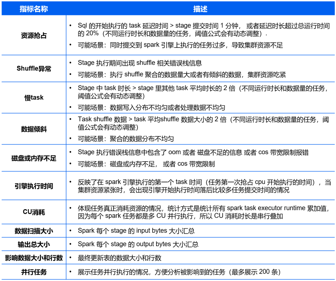 3. 问题根因定位:可以自助排查分析任务运行情况的诉求,如:定位 Spark 任务运行缓慢或失败的原因,如资源抢占,shuffle 异常,数据倾斜等情况,都有清晰的定位