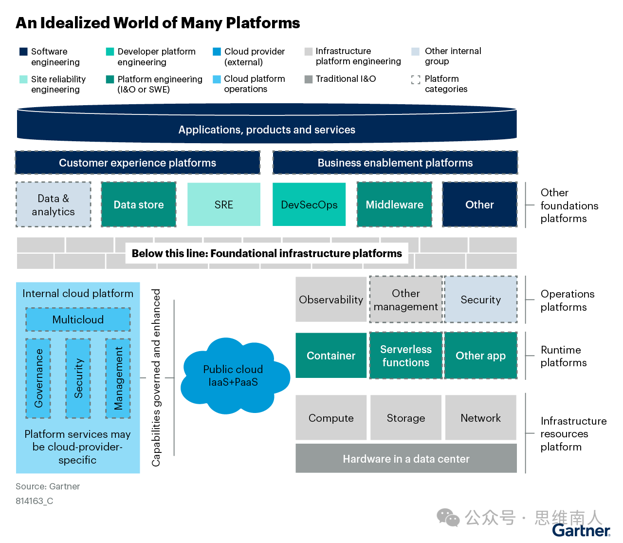 那么平台工程应该建哪些,由哪个团队负责,均无定数。在这里我列出一个GARTNER的理想框架图(见图四),但要注意,这仅供参考,因为连GARTNER都特意标明这是“Idealized”而不是他们常用的“recommend”。每个企业应该根据自身需要,通过四象限法则并结合自有资源、团队规模、技能储备等情况确定各功能域的平台工程化优先级和相关负责人。